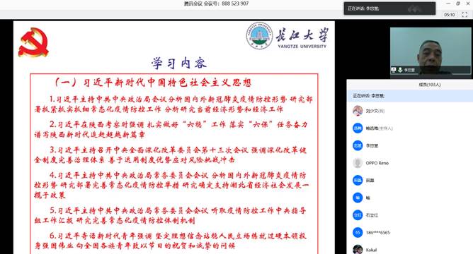 张光明书记带领师生在线学习了习近平主持中共中央政治局会议分析国内外新冠肺炎疫情防控形势,研究部署抓紧抓实抓细常态化疫情防控工作,分析研究当前经济形势和经济工作;习近平在陕西考察时强调,扎实做好“六稳”工作 落实“六保”任务奋力谱写陕西新时代追赶超越新篇章;习近平主持召开中央全面深化改革委员会第十三次会议,强调深化改革健全制度完善治理体系,善于运用制度优势应对风险挑战冲击;习近平主持中共中央政治局常务委员会会议,分析国内外新冠肺炎疫情防控形势,研究部署完善常态化疫情防控举措,研究确定支持湖北省经济社会发展一揽子政策;习近平主持中共中央政治局常务委员会会议,听取疫情防控工作中央指导组工作汇报,研究完善常态化疫情防控体制机制;习近平寄语新时代青年强调,坚定理想信念站稳人民立场练就过硬本领投身强国伟业,向全国各族青年致以节日的祝贺和诚挚的问候等专题学习内容。