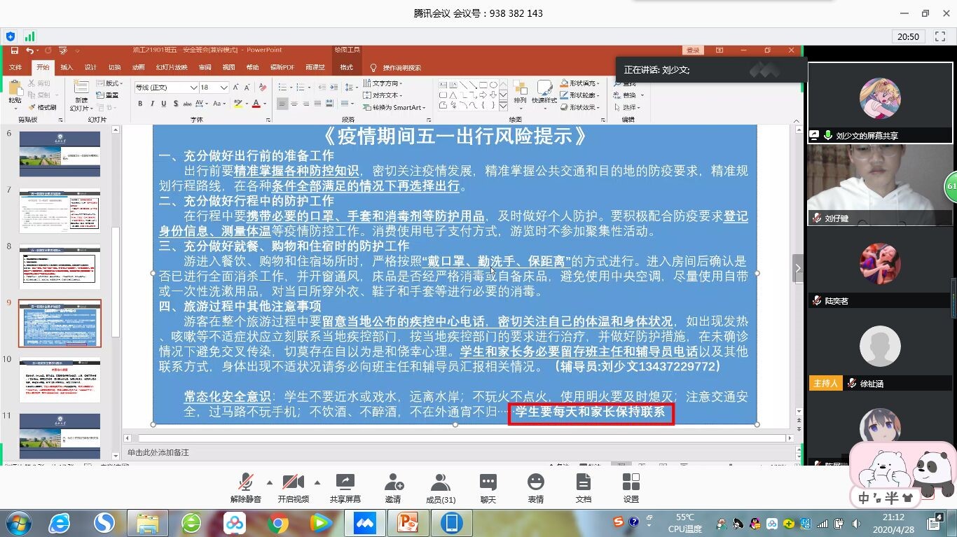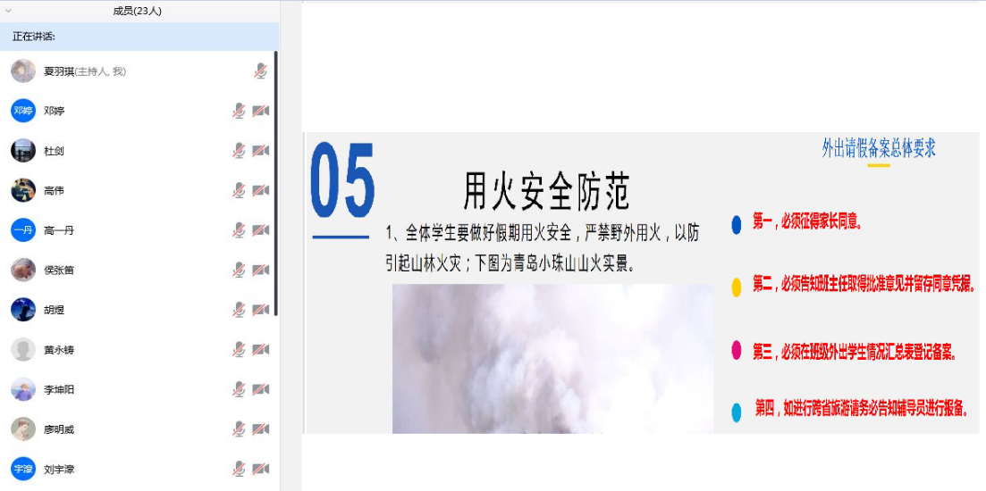4月26日开始,各班召开“五一假期安全教育班会”,全体班主任、员工线上召开班会,对疫情发展、出行防护、安全返回以及吃住行、盗火水、坛心网、毒艾恐”12个方面进行了详细教育。公司向全体员工发布了《疫情期间五一出行风险提示》,对出行的前期准备、旅途防护、就餐购物和住宿安全等做了详细的提示。同时制定了辅导员-班主任-安全员三级安全体系,全面实时了解员工动向,对于出行的员工进行的填表登记,按照程序填报出行信息和安全健康信息,加强员工在五一以及居家时期的安全保障。