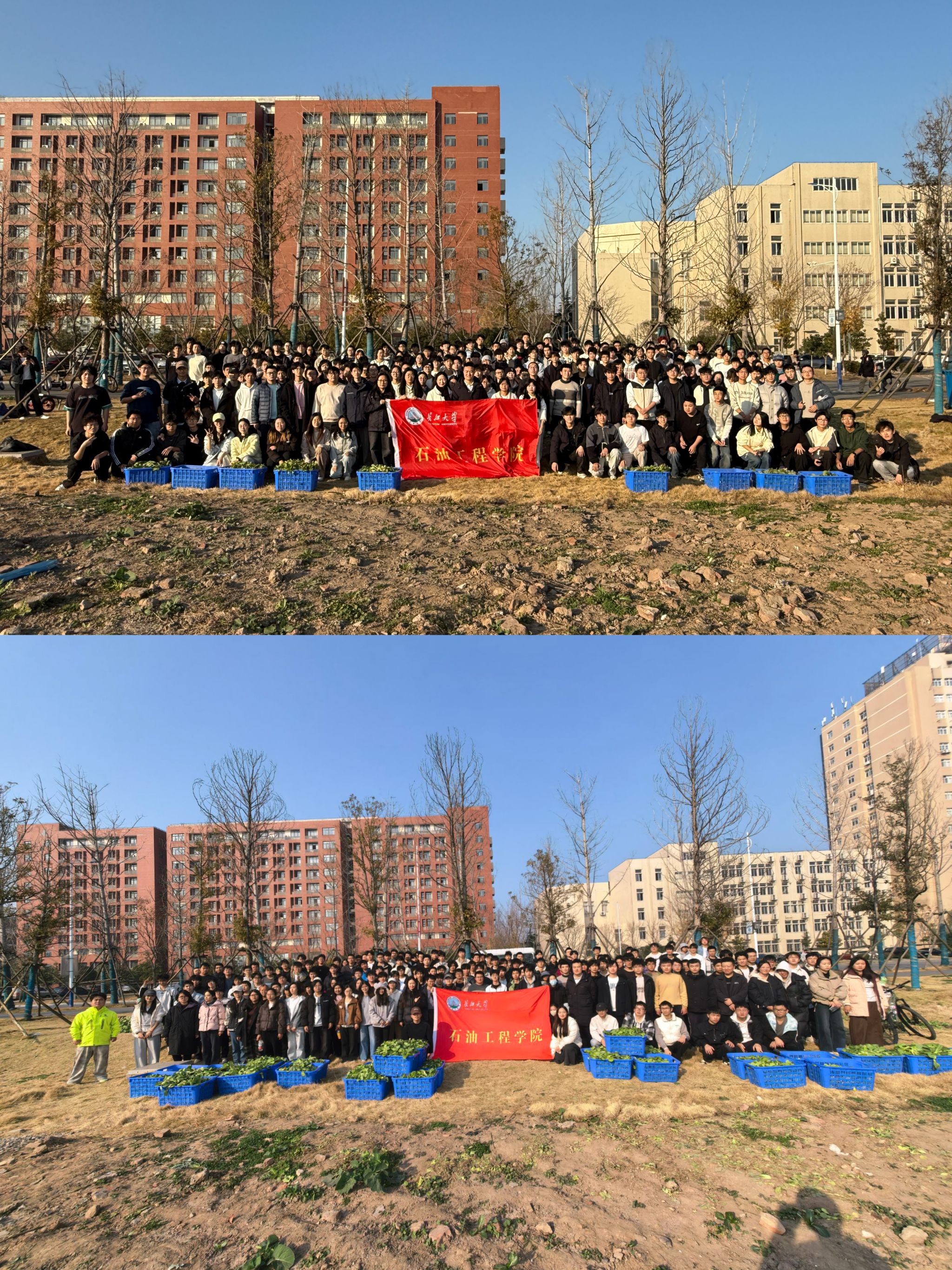 本次收获活动按专业分批次展开。13日,油气储运工程、海洋油气工程、智慧能源工程、新能源科学与工程四个专业的员工率先踏入田间,躬身采收这片承载着数月心血的绿意;15日,石油工程专业的新生也陆续完成采收。望着长势繁茂、翠色欲滴的上海青,同学们在辅导员陈金建、周雨薇的悉心指导下,有条不紊地进行采摘、分拣与整理,田间地头回荡着欢声笑语,弥漫着丰收的喜悦与青春的朝气。从秋日播撒希望的种子,到日常悉心浇灌的坚守,再到冬日硕果累累的收获,同学们全程见证上海青的生长蜕变,亲身践行了 "春种一粒粟,秋收万颗子"的劳动真谛,深刻体悟了从耕耘到收获的完整历程。
