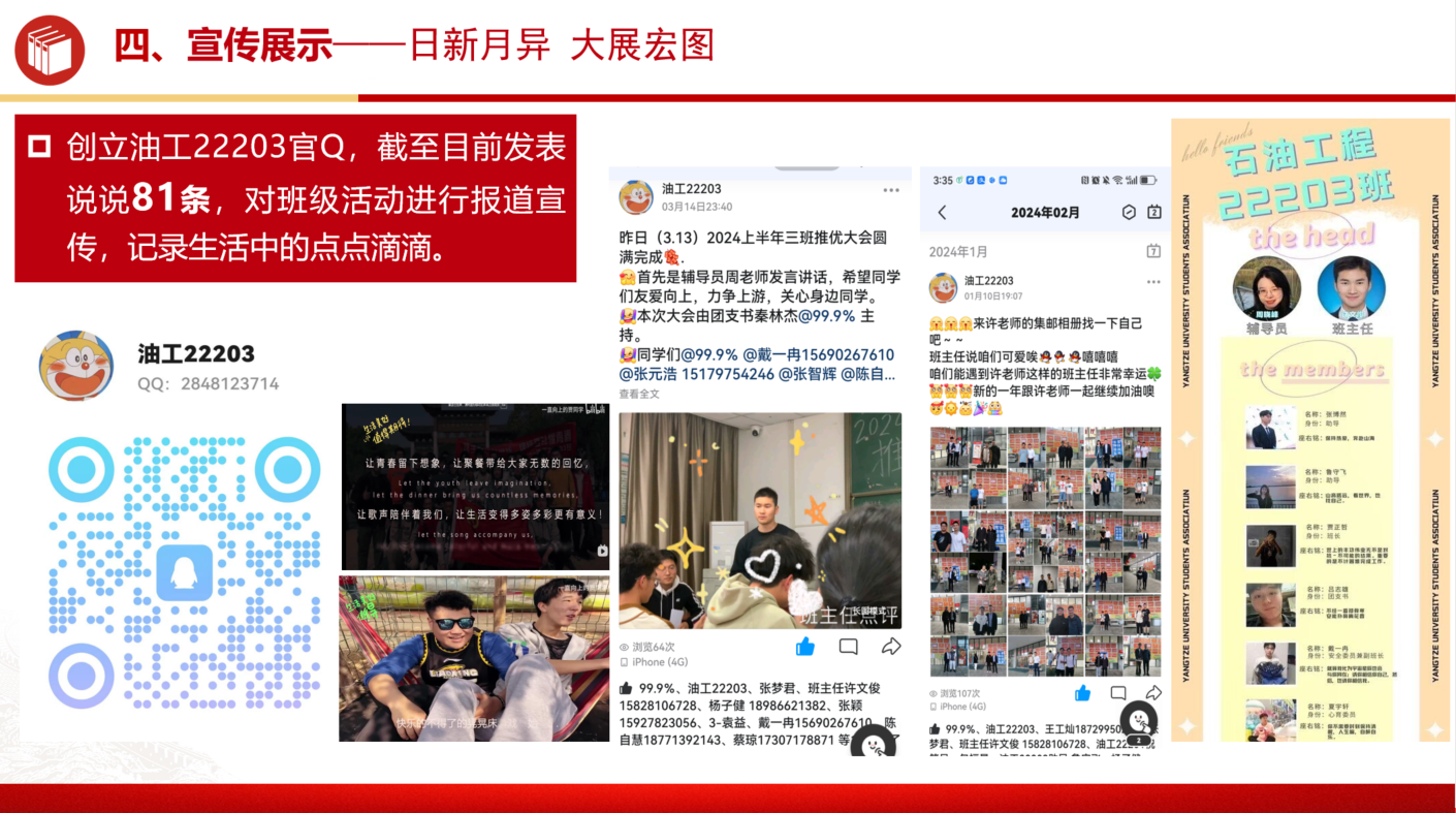为了加强班级的凝聚力和集体责任感,我们利用哔哩哔哩、抖音、手机QQ等多种新媒体平台,记录并宣传班级的活动和进步。班级建立了官方QQ账号,每周发布活动动态,分享同学们的成长点滴,让更多人了解我们这个充满活力的集体。至今已累计发表了八十余条空间说说动态,生动展示了班级成员的风采,记录了班级的发展历程。
