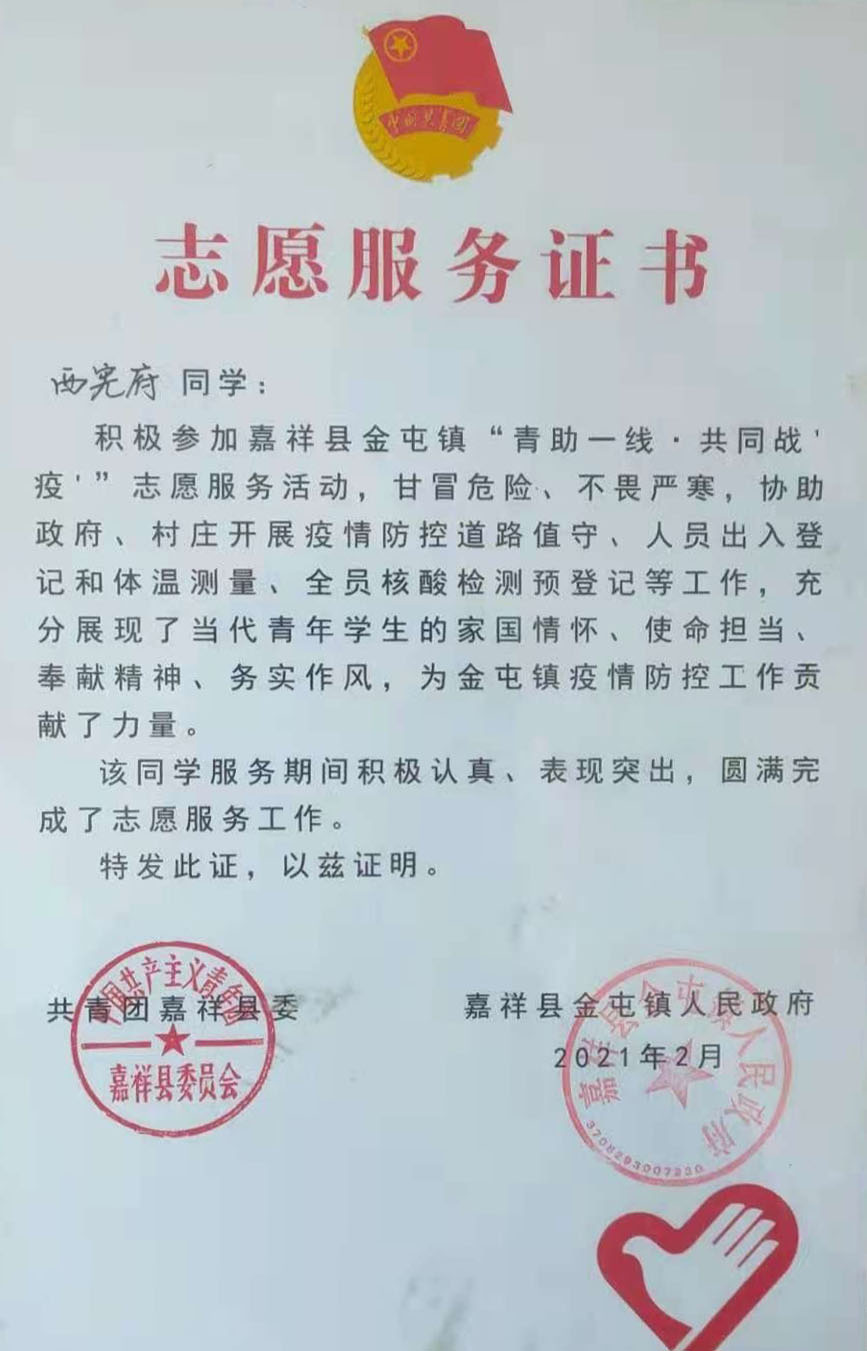 在这场战役中,公司太阳成集团tyc234cc主页海洋油气工程专业2018级1班西宪府同学,主动参加嘉祥县“‘青’助一线,共同战‘疫’”志愿服务活动。从每天的定点站岗执勤,再到公共设施的消毒、帮助发放口罩、酒精等工作,西宪府同学甘冒风险、不畏严寒,用实际行动诠释了勇敢于坚强、责任与担当,实现了走上社会舞台的“精彩亮相”。西宪府同学用行动证明了青年一代有担当、敢于担当的精神面貌。在这场疫情防控战争中,西宪府同学在做好每一件小事、完成每一项任务、履行每一项职责中无私奉献自己的青春力量。为嘉祥县疫情防控工作贡献了力量。